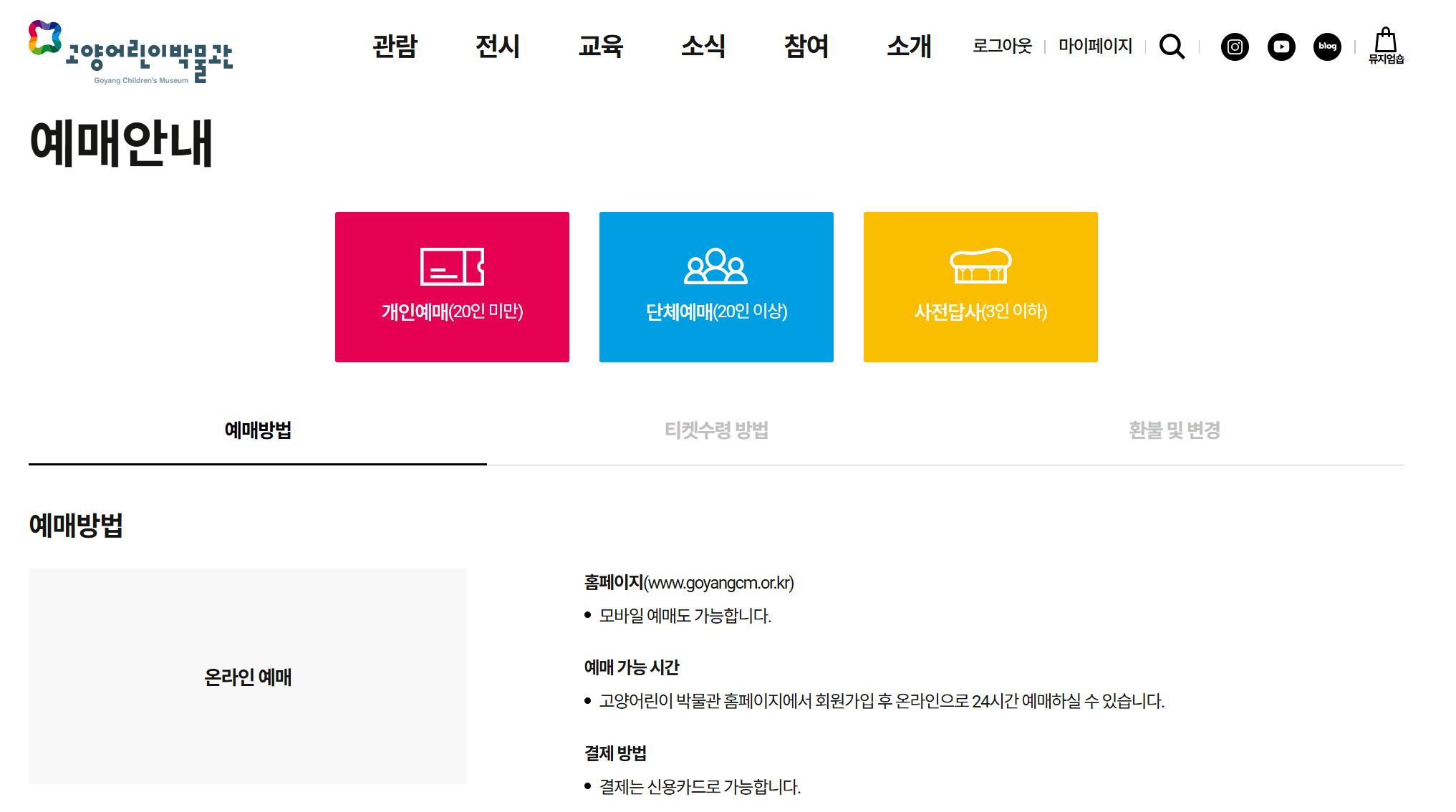 고양어린이박물관 (goyangcm.or.kr) 에서 홈페이지 가입 후 예매안내 - 개인예매 또는 단체예매