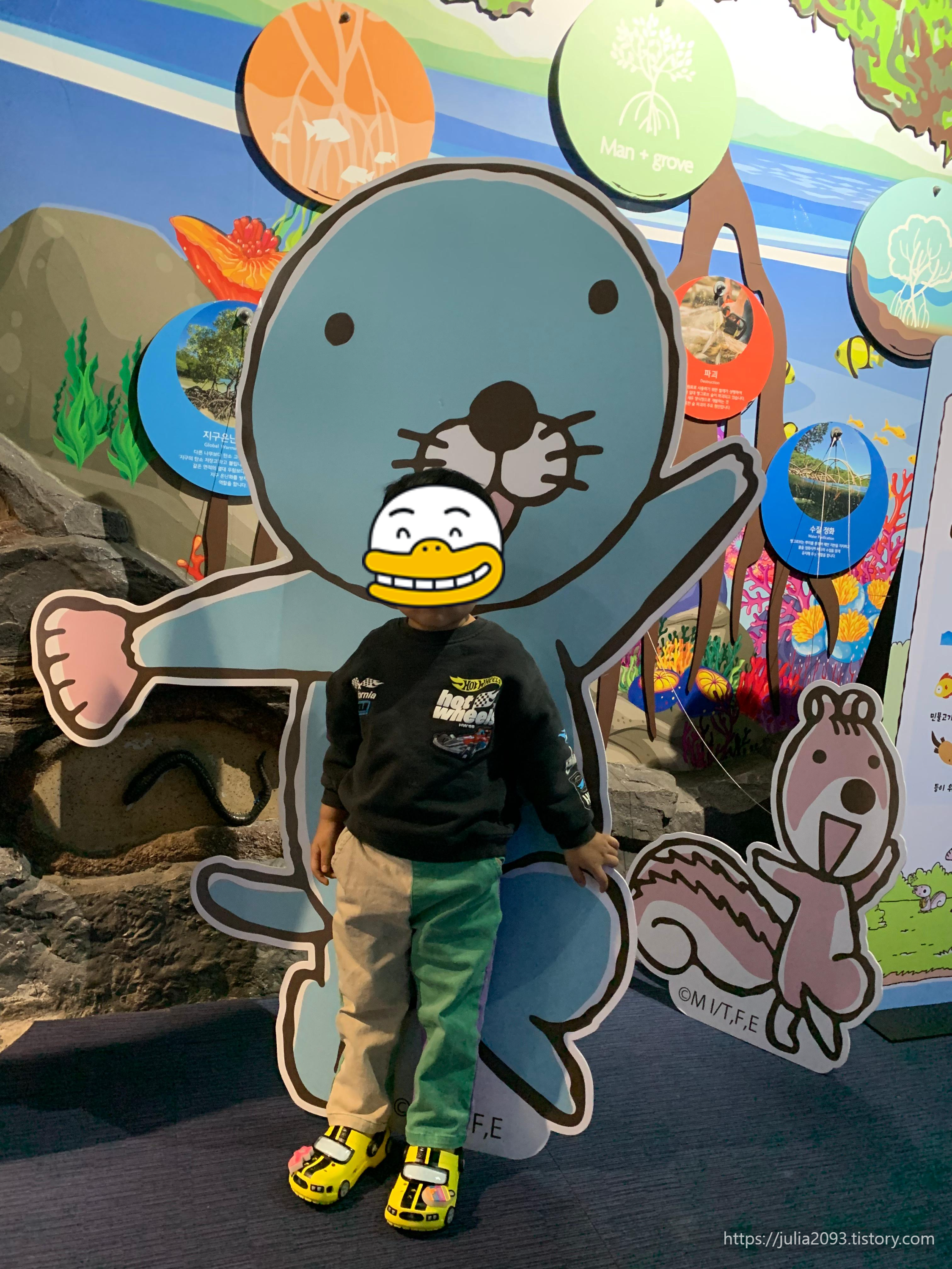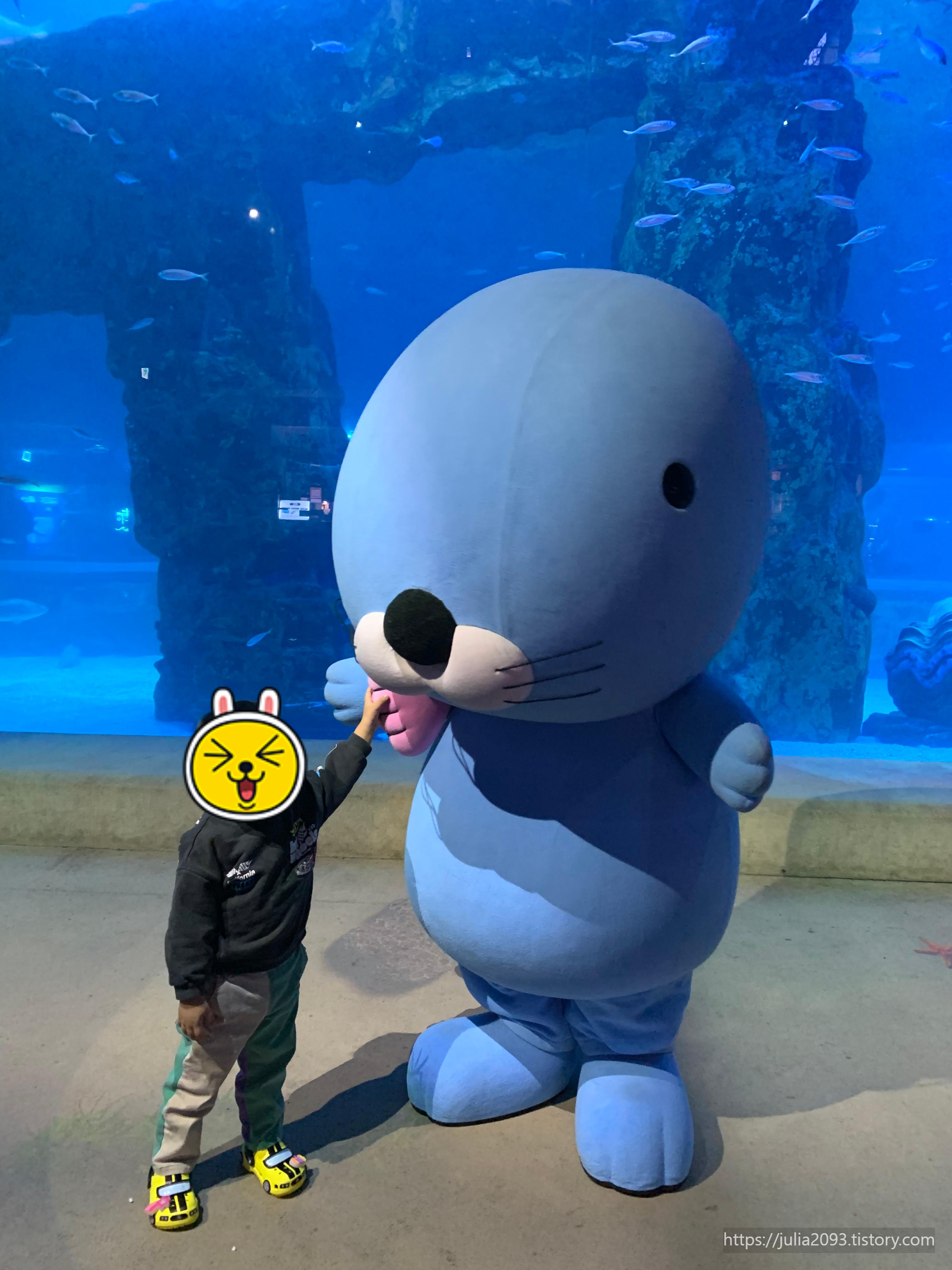 메인 수조(B2F) 앞에서는 보노보노 인형탈과 사진찍기 가능(하루 오후2시, 5시30분 2번)