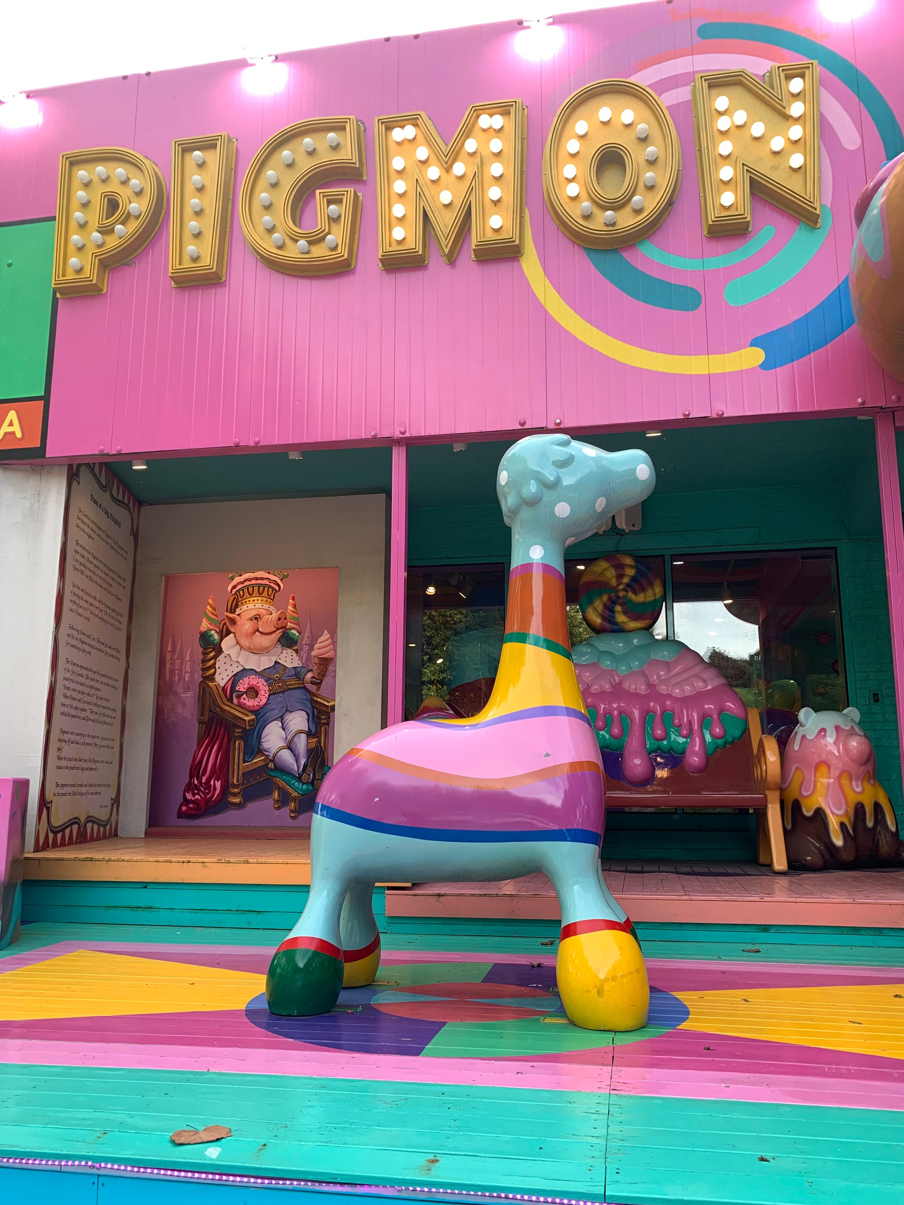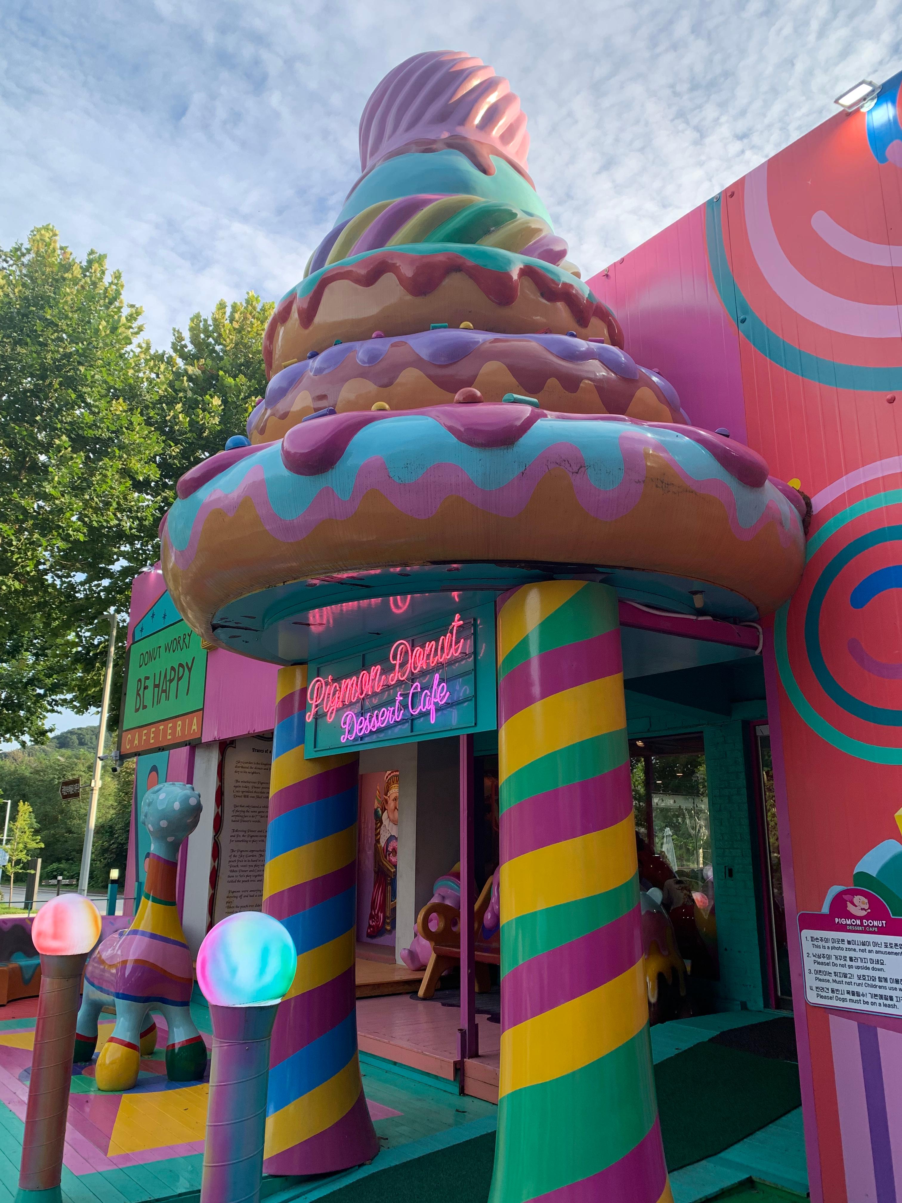 피그몬 카페는 알록달록한 색감과 귀여운 캐릭터들로 가득한 공간입니다. 카페의 외관은 마치 동화 속에서 튀어나온 듯한 느낌을 주며, 입구에는 거대한 아이스크림 콘 조형물이 방문객을 반깁니다.