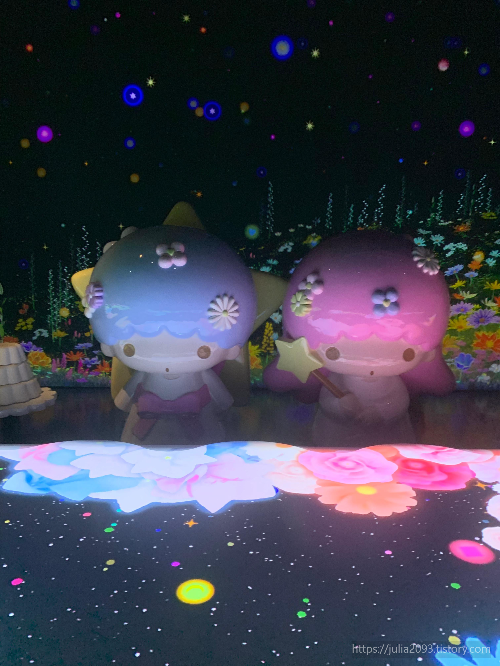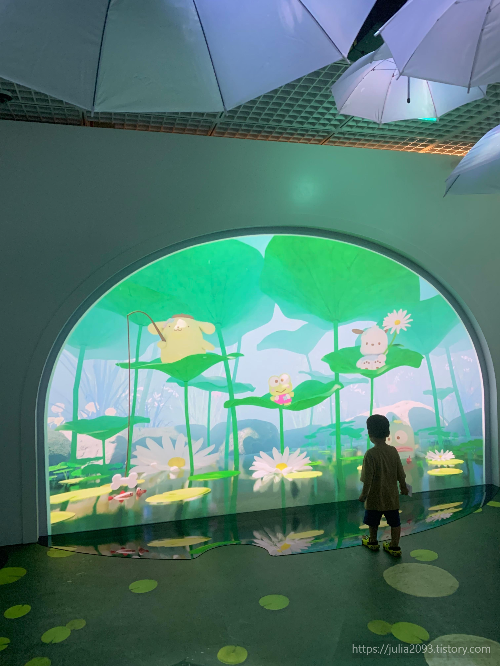 미디어아트 전시답게 전체 룸이 영상으로 가득한 방이 두 세곳 있어요. 아이들도 살짝 무서워하다가 금방 적응하더라구요. 특히 케이크 모양을 테이블 위에 올려놓으면 화면에서 꽃이 만개해서 여러 캐릭터들과 함께 피어납니다:)