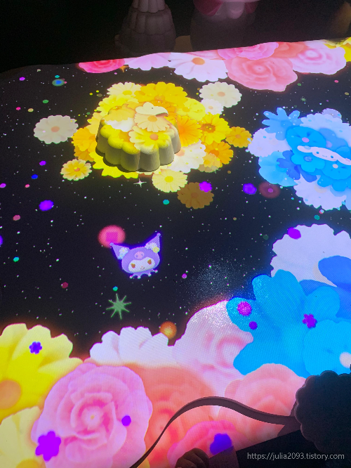 미디어아트 전시답게 전체 룸이 영상으로 가득한 방이 두 세곳 있어요. 아이들도 살짝 무서워하다가 금방 적응하더라구요. 특히 케이크 모양을 테이블 위에 올려놓으면 화면에서 꽃이 만개해서 여러 캐릭터들과 함께 피어납니다:)
